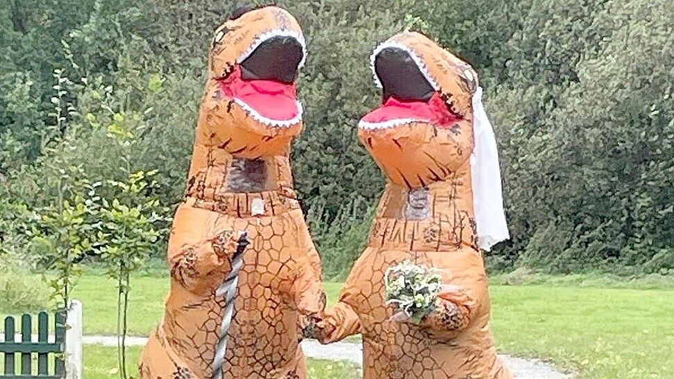 Originelle Hochzeitskleidung: Westoverledinger Brautpaar im Dino-Kostüm