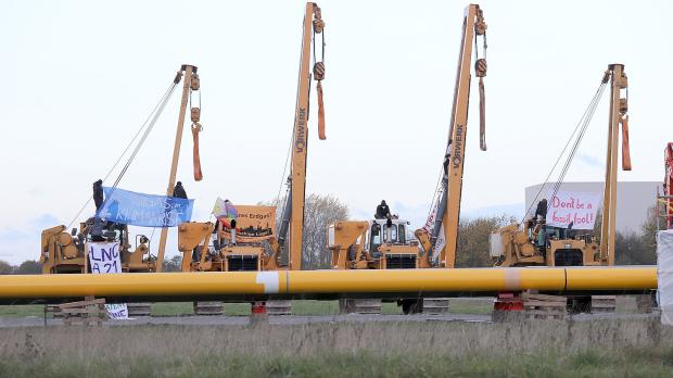 Greenpeace fordert bei einer Aktion am Veranstaltungsort die Abkehr von fossilen Energien. Foto: Kay Nietfeld/dpa